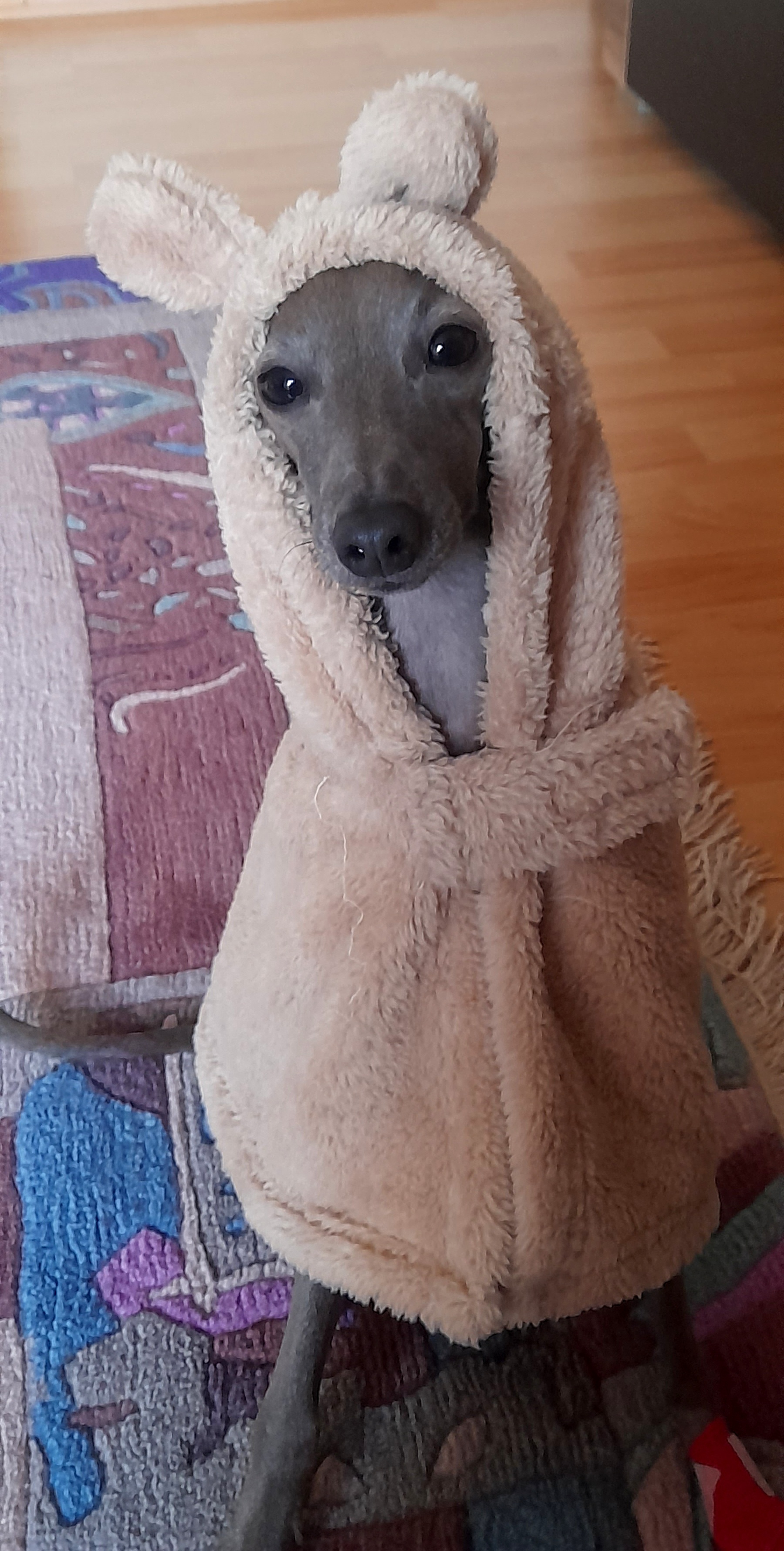 Я на первом фото мордочку сначала не увидела 😂 такой теплый флисовый костюмчик у меня тоже есть, люблю в него закутаться.
